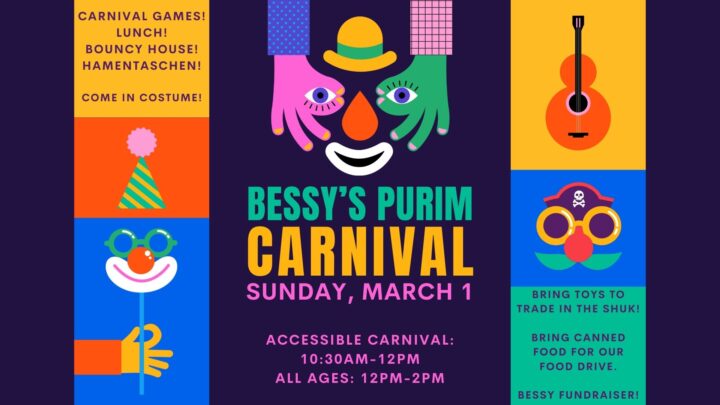 The Purim Carnival is March 1! This beloved Beth Emet tradition raises money for our teen program. The carnival includes games, prizes, lunch, a bouncy house, a food drive, a Shuk, and so much more! The Purim Carnival is 12:00 pm – 2:00 pm on Sunday, March 1, with our Accessible Carnival beforehand, 10:30 am – 12:00 pm. All kids 6th grade and younger should be accompanied by a grownup.