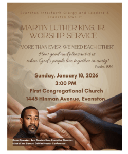 Guest speaker Rev. Damien Durr will share reflections on this year’s theme, “More than Ever, We Need Each Other.” Music will be led by the Second Baptist Church. The service will include a special report from Rev. Dr. Michael Nabors and the Reparations Stakeholder Authority of Evanston. This event is free and open to the public.